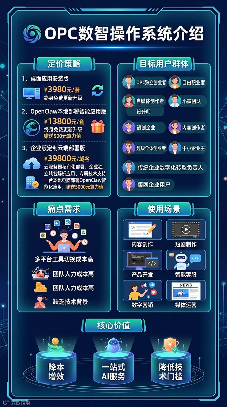 OPC数智操作系统,是一款集成多元功能、赋能高效办公的全场景数智应用操作系统,聚焦“一人成军”的核心需求,打破传统办公壁垒,让超级个体拥有团队级生产力。