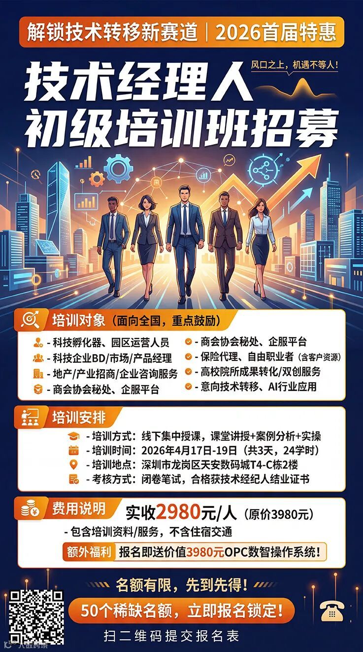 风口之上,机遇不等人!50个稀缺名额,先到先得,赶紧报名锁定你的职业新赛道,成为连接科技与产业的核心桥梁,共享技术转移行业发展红利!