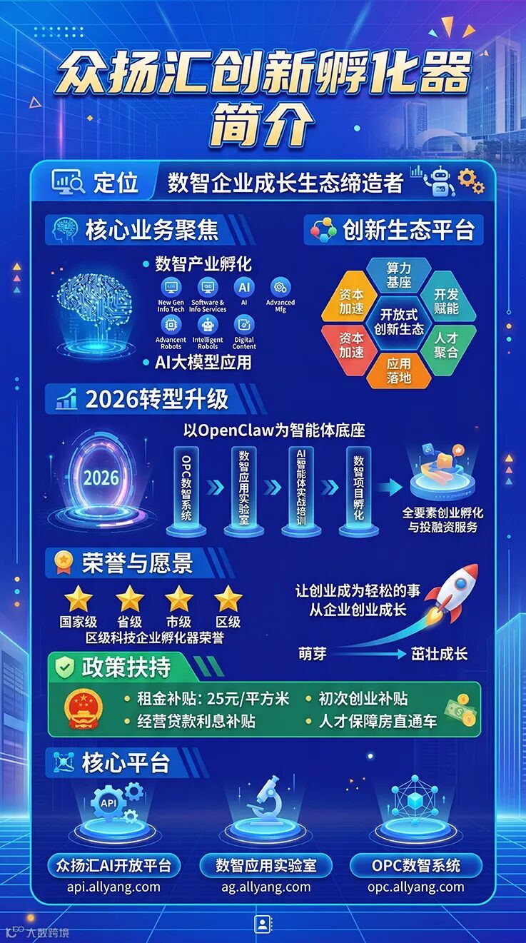 众扬汇创新孵化器定位为数智企业成长生态缔造者,聚焦于数智产业(新一代信息技术、软件与信息服务产业、人工智能、先进制造业、智能机器人产业、数字内容创意产业)的培育、孵化、投资;以垂直行业AI大模型(智能体)为核心,集“算力基座、开发赋能、人才聚合、应用落地、资本加速”等六位于一体的开放式创新生态平台。我们不再仅仅是物理空间的提供者,而是成为AI时代垂直行业智能化转型的赋能引擎和生态构建者。通过创新的商业模式和产品矩阵,实现从“服务收入”到“生态价值共享”的跨越,打造可持续、高增长的盈利能力。