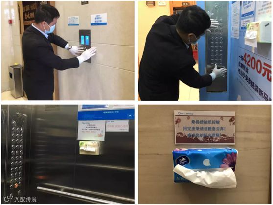 ▲最人性化的免触碰式电梯按键:小心翼翼地用保鲜膜贴在电梯按键上,再在电梯按键旁挂上一袋纸巾,业主可以用隔着纸巾按电梯按键,完全避免直接触碰电梯按键。