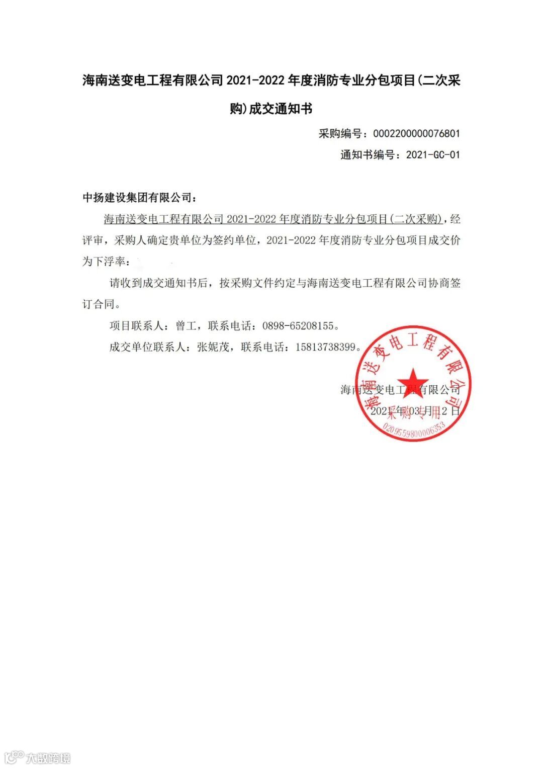 喜报-中扬集团中标海南送变电工程有限公司2021-2022年度消防专业分包项目