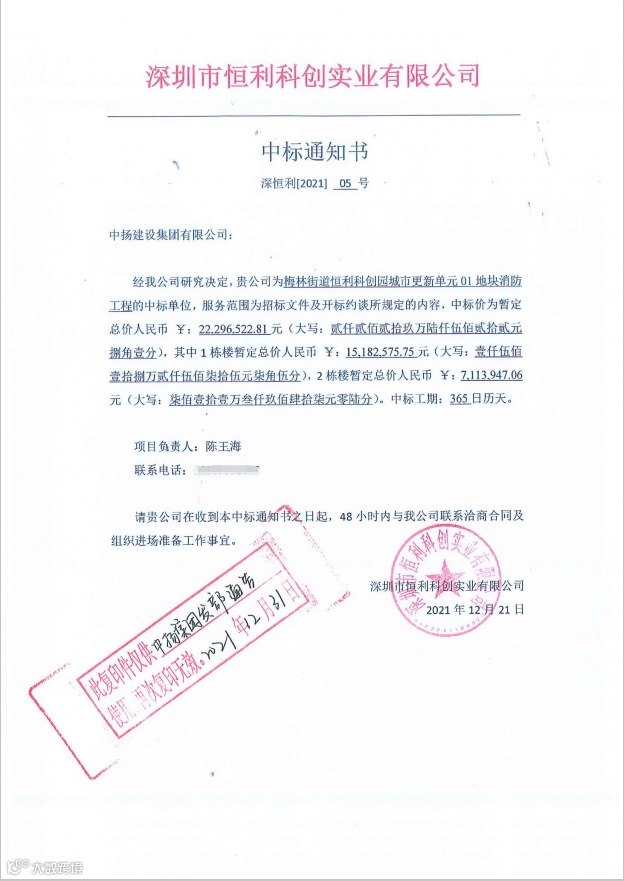 喜报-中扬集团中标《梅林街道恒利科创园城市更新单元01地块消防工程项目》