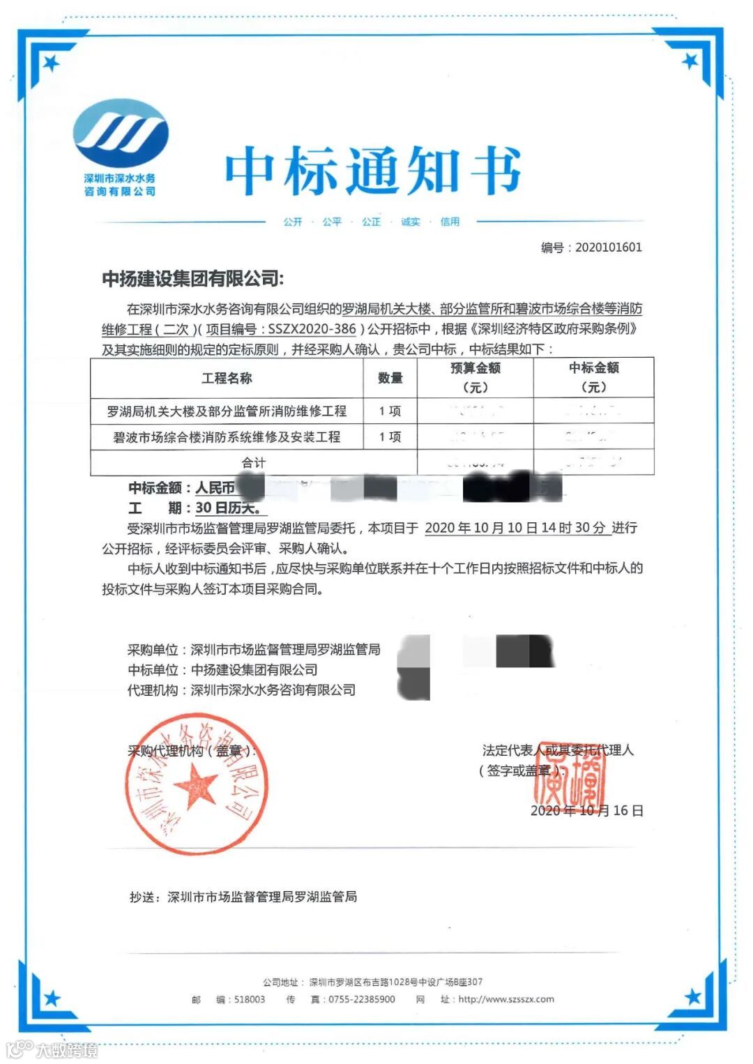 中扬建设集团 2020年10月10日,深圳市市场监督管理局罗湖监管局委托深圳市深水水务咨询有限公司就罗湖局机关大楼及部分监管所消防维修工程、碧波市场综合楼消防系统维修及安装工程两个项目进行了公开招标。
