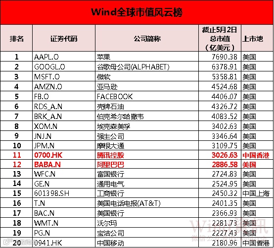 Wind全球市值“风云榜”显示,截止5月2日,全球市值Top10中前五家均被科技公司霸占。腾讯和阿里巴巴位列第11和12名,阿里巴巴当前的市值约为2886.58亿美元,中国互联网巨头,大有赶超前人之势。