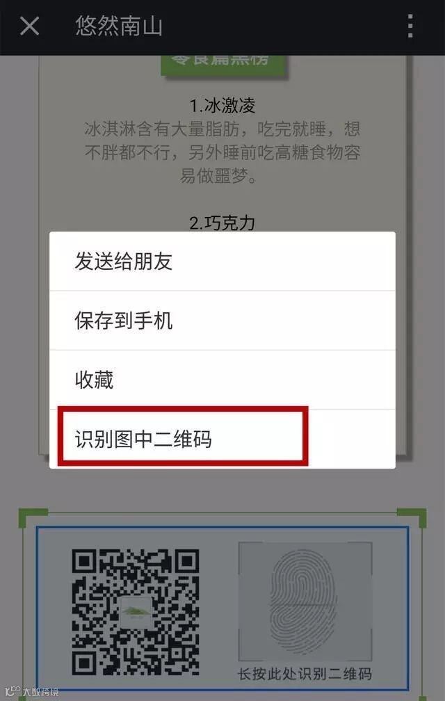 如何扫描手机里一张含二维码的图片?拿另一个手机扫?保存起来,在扫一扫中从相册选图片?NO!只要你查看图片时长按,并在接下来弹出的菜单选项中选择“识别图中的二维码”就行了。