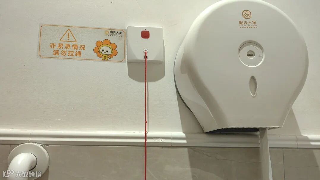 阳光人家随处可见上图的安全绳,比如居民食堂、客厅、卧室、洗手间等区域,但凡老人活动的区域都有这种安全拉绳。