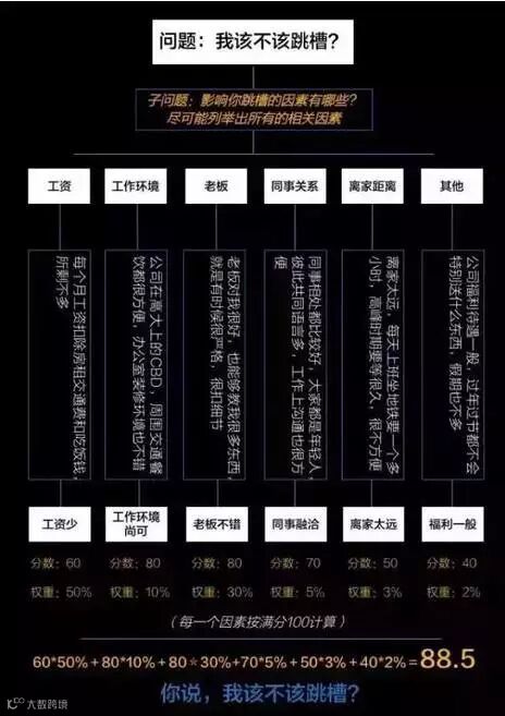举个例子,比如你现在遇到的问题是:“我该不该现在跳槽?” 那么对这个问题的分解可以如下图所示: