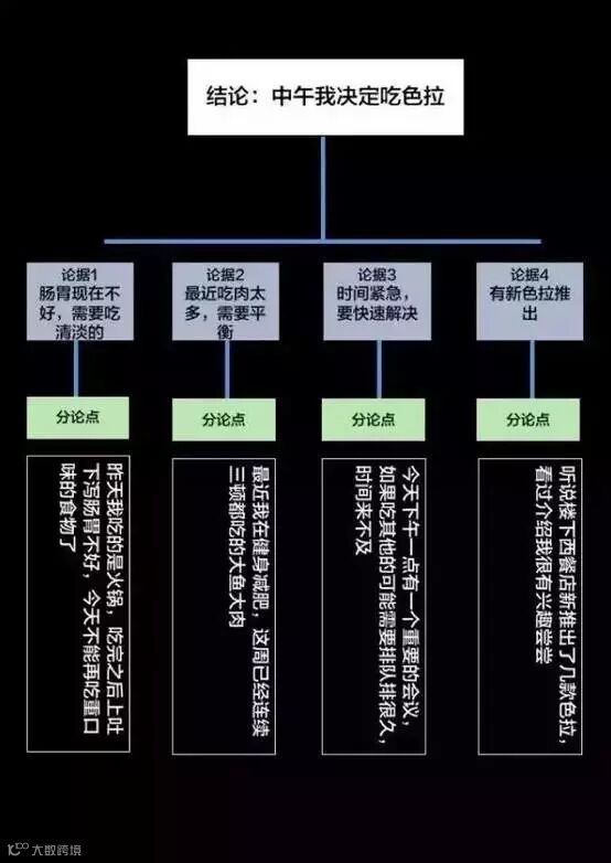 无论是谁,都会喜欢这样的陈述方法。这也是为什么,当你给领导汇报工作的时候,他们绝不可能听你长篇累牍的解释分析,他们只会听你的结论,或者解决方法。当他们有兴趣的时候,会追问细节,当他们很忙的时候,他们只需要听到最重要的东西。