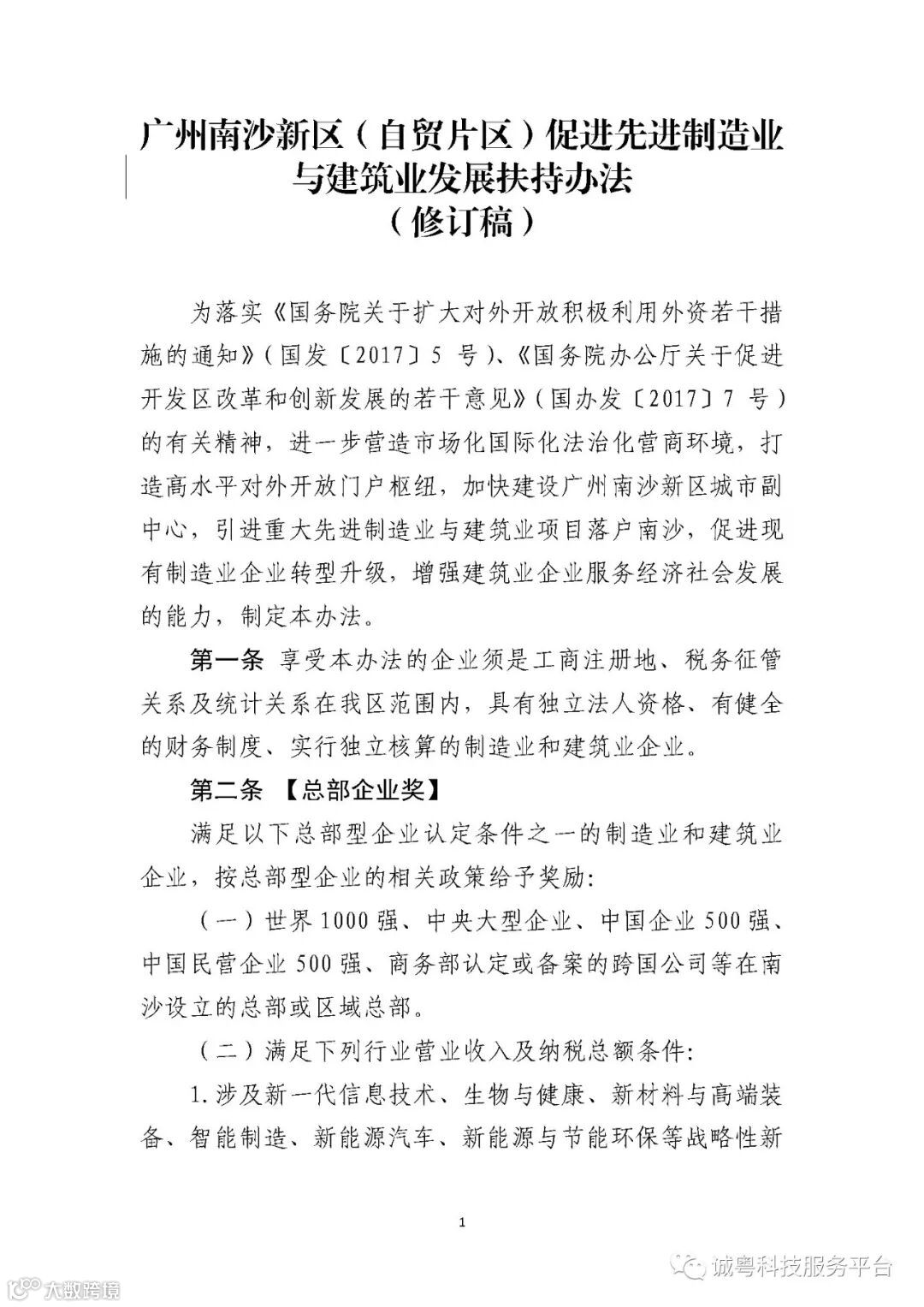 附件:广州南沙新区(自贸片区)促进先进制造业与建筑业发展扶持办法(修订稿)