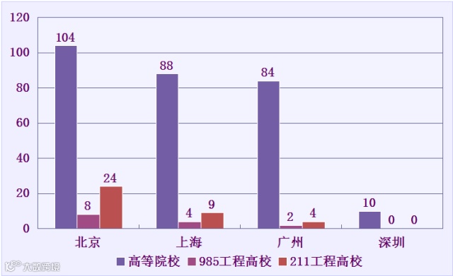 在教育资源方面,北京在全国拔得头筹,高等院校104所,985工程高校8所,211工程高校24所。此外,北京还是中国两大国家智囊机构——中国科学院和中国工程院的绝大部分研究院所在地。