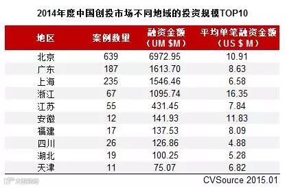 (2014年度中国创业投资地区分布TOP10。投中集团数据)