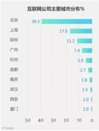 (2014年互联网公司主要城市分布占比。拉勾网数据)