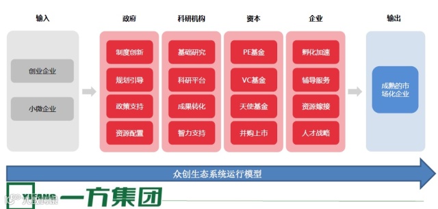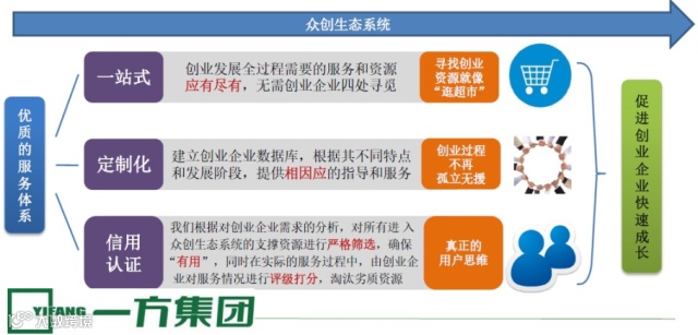除了中关村大街这种单一功能的创新创业平台,一些投资集团或企业也在筹建聚合各种创新要素的创新创业加速器,最为典型的是一方集团的众创生态系统。