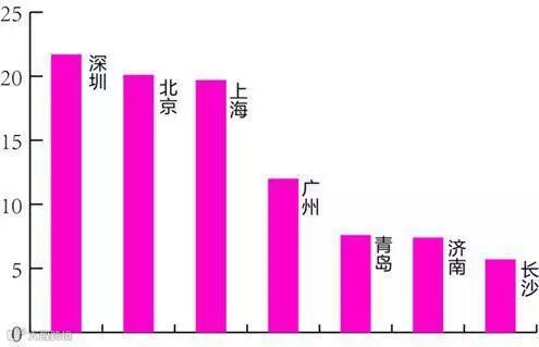 深圳土地面积相对狭小,仅有2000多平方公里,相对北京市上万平方公里的面积,更显得寸土寸金。《全国35个重点城市房价收入比排行榜(2014)》显示,深圳以21.7居榜首,深圳家庭买一套100平方米的房子,需要花费21.7年收入。