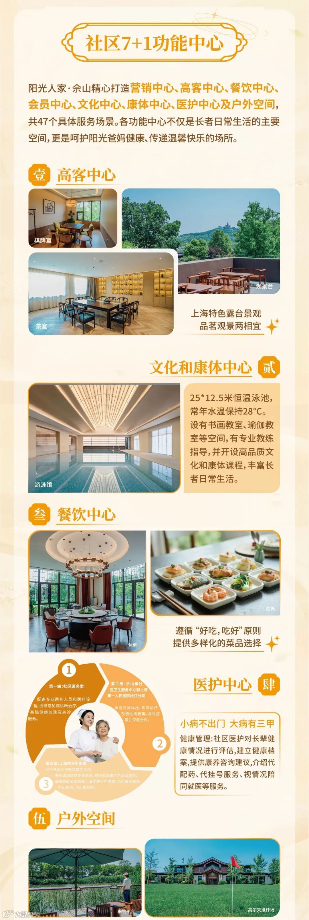 社区“7+1功能中心”构建起一站式高端康养生活网络。高客中心的主会所大堂,全天候管家随时待命,代订旅行、策划家宴、信件代发等服务一应俱全;主会所二层,茶室、棋牌、KTV满足高端商务会客与休闲娱乐需求;上海特色露台景观搭配定制下午茶,品茗观佘山的惬意在此拉满。康体中心的25×12.5米恒温泳池四季温暖,文化中心的书画室、教培空间里高资质教练带你解锁多样课程;户外空间则将自然绿意融入日常,让每一次漫步都成为康养的一部分……