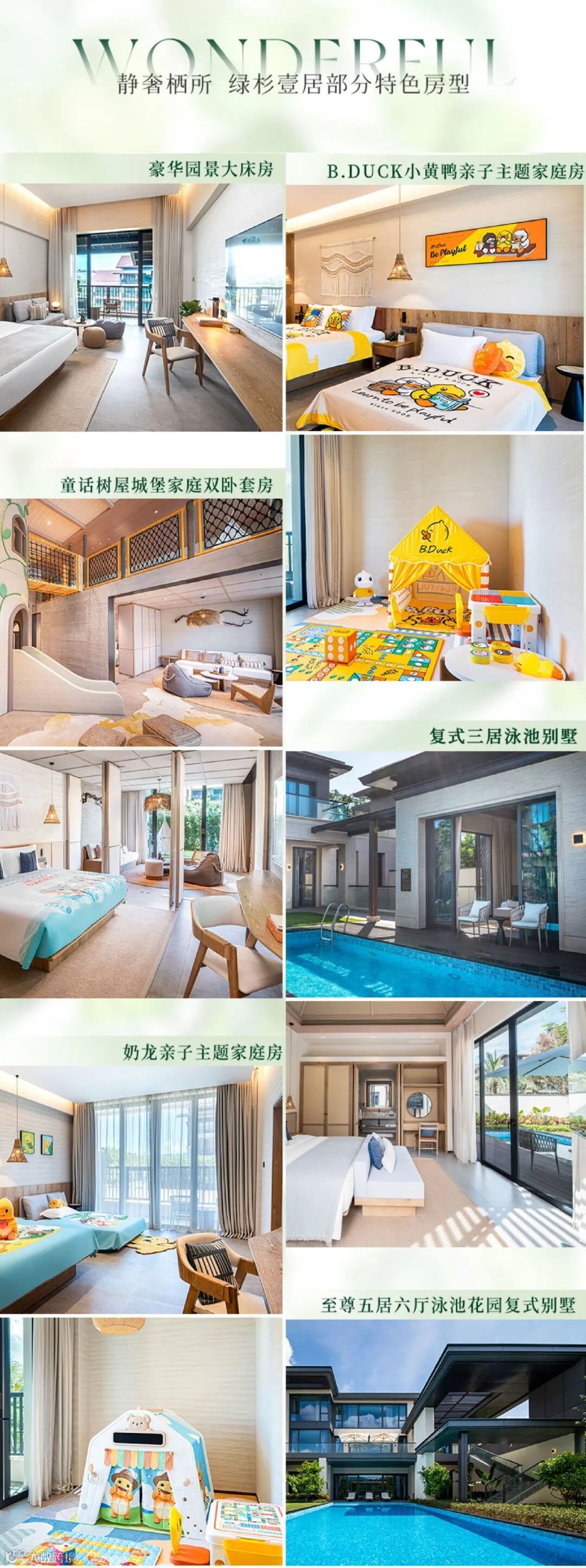 从亲子主题家庭房(小黄鸭、奶龙、奇幻鸟巢、童话树屋等主题童趣设计)到复式泳池别墅,满足不同家庭结构的旅居需求,每一处空间都充满设计感与舒适感。