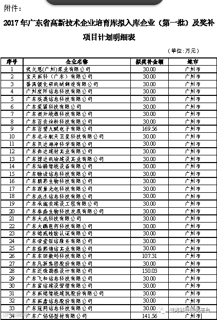 附件: 2017年广东省高新技术企业培育库拟入库企业(第一批)及奖补项目计划明细表
