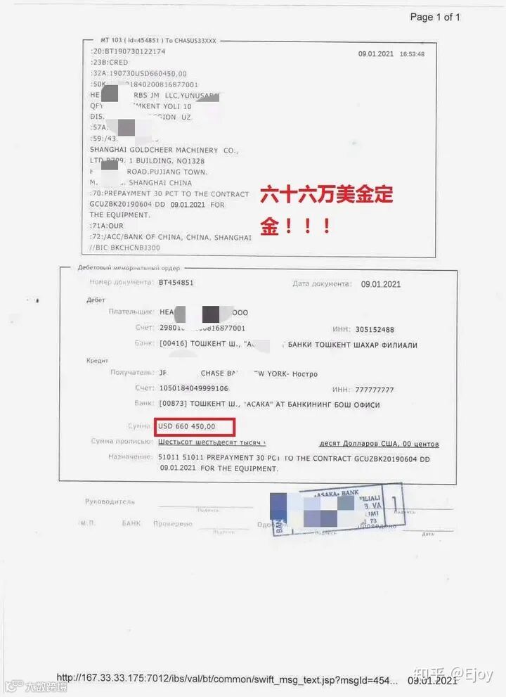 回国后就开始了每天到后来的每周改合同改资料的节奏了。今天改个付款条件,每天改一条仲裁条件,后天再改一条运费加到其他设备价格不显示,再过两天再改一条把安装调试费加到其他设备里不单独显示,过一周又改一下附件清单要这么个格式。。。。。。这样每周说下周打款的时候下周就改一条,直到再一次客户说周一给你打预付款,但是那个时候,我已经不相信他说的话了,我觉得到周一银行又会要求改一条,周日的时候客户又发信息说明天给你汇款我说OK,但是我还是没有相信了,周一晚上吃玩晚饭,没看微信,结果两三个人电话打过来了,要我核对银行账号正确不正确,这个细心和谨慎真是值得称赞啊,不过想想也是很严谨,毕竟这个66万美金预付款如果打到骗子账号了那双方都要抱头痛哭了,看来这次是真格了。周二的时候我也没有去问,早上就发水单给我了。