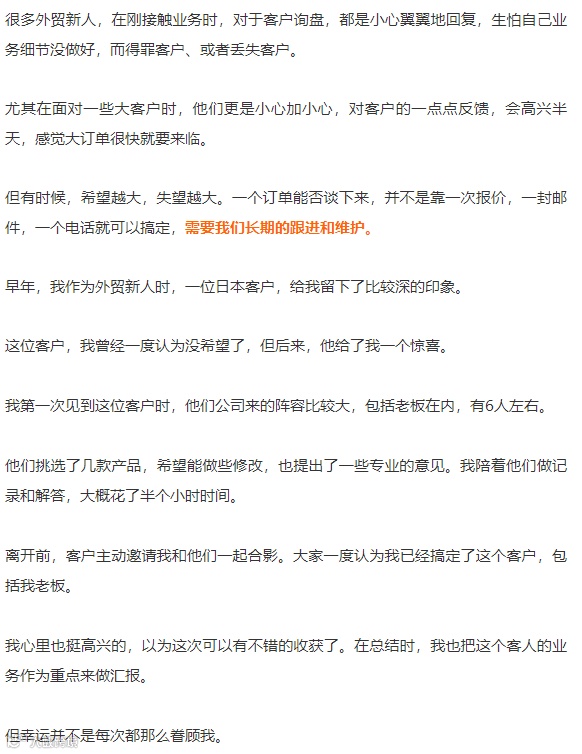 但通过我差不多一年的跟进,这个客户后来还是给我下单了。