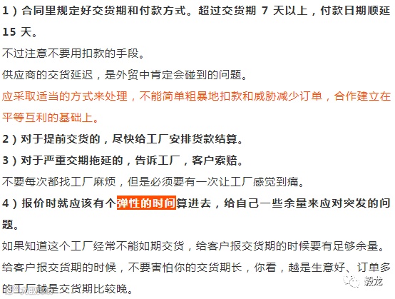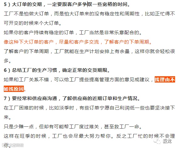 10)有些对交货期要求比较高的订单,告诉工厂客户做的是信用证订单,交期延误范围不能超过 5 天,否则延误船期,出货会有风险。
