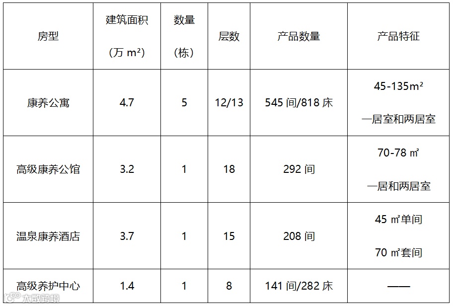 阳光人家占地面积97.8亩,建筑面积15万㎡,容积率是1.79。社区可以分为温泉康养酒店、康养公寓、高级康养公馆、高级养护中心和综合配套服务区五个功能区域,可提供1186个房间,1500张康养床位。