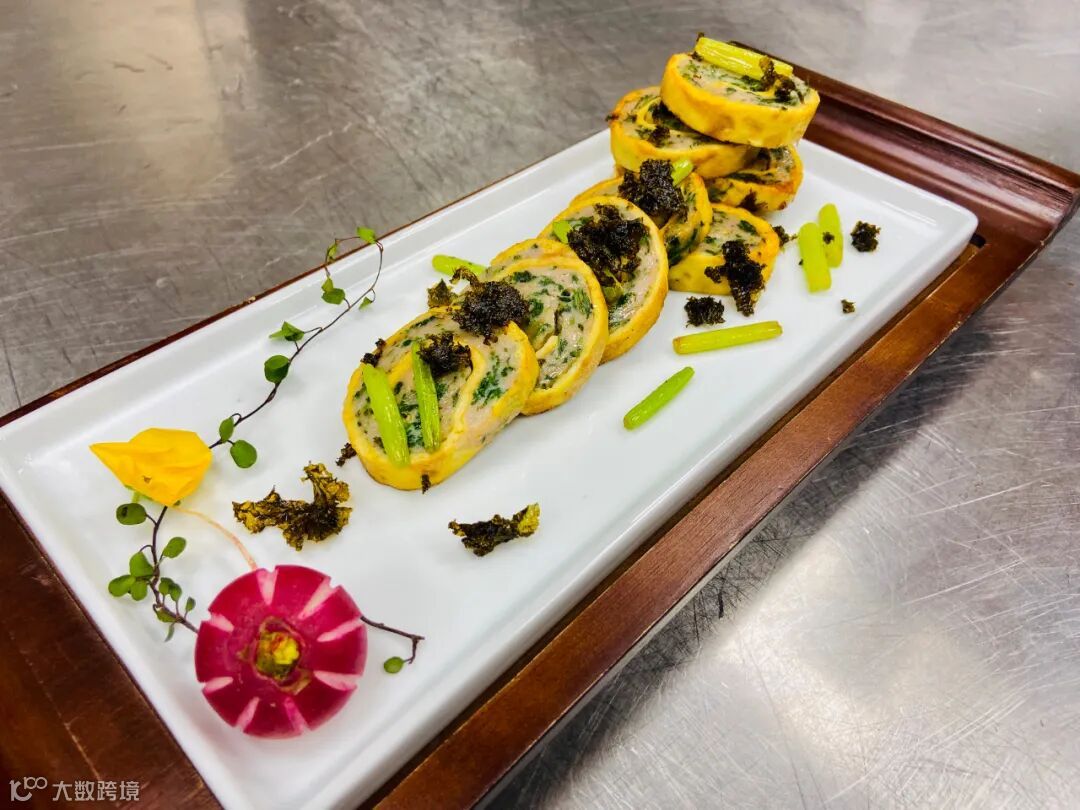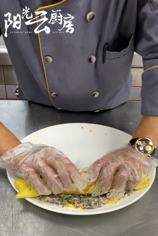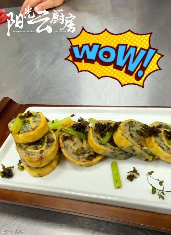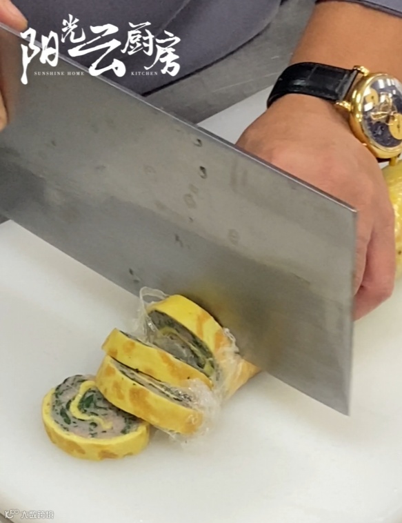 把拌入艾叶的肉胶平铺在鸡蛋皮上,卷成一卷,放入蒸笼蒸6分钟后取出,放凉后切片待用