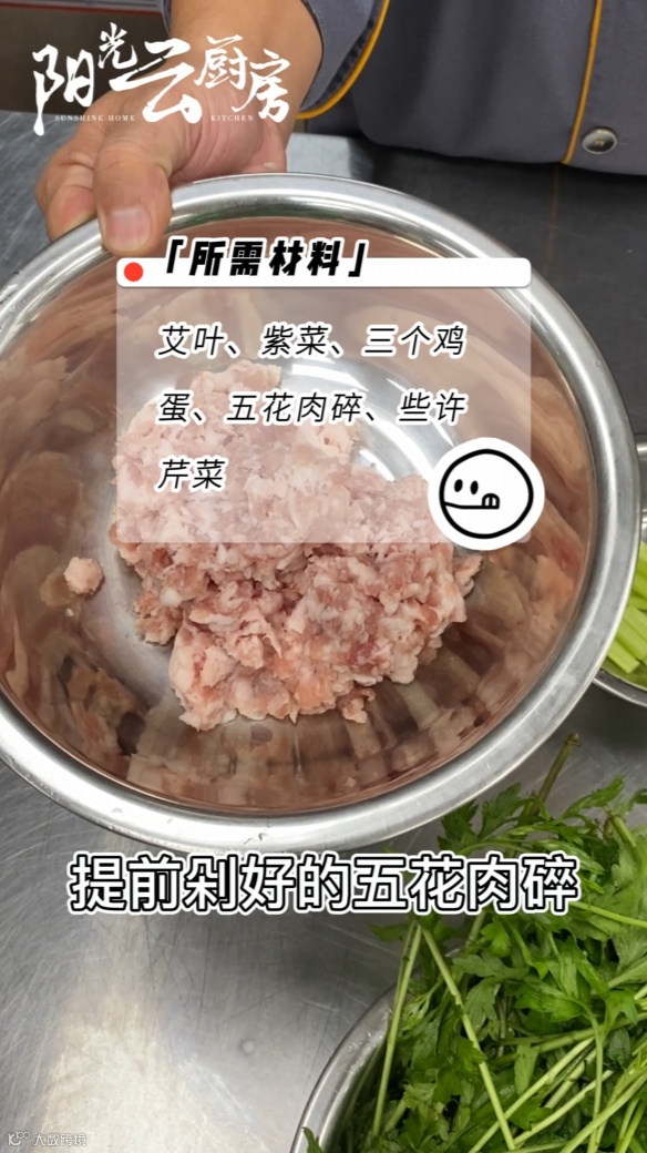 所需食材:艾叶,猪肉,鸡蛋,香芹少许,紫菜、姜葱少许,调料少许;采摘新鲜的艾叶回来,取鲜嫩部分,洗净焯水后,挤干水分,切碎备用;猪肉去皮,剁碎成肉胶,倒入准备好的艾叶碎,加适当调味料,搅拌均匀备用