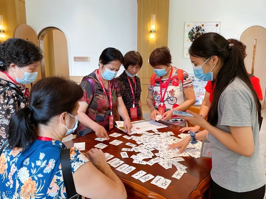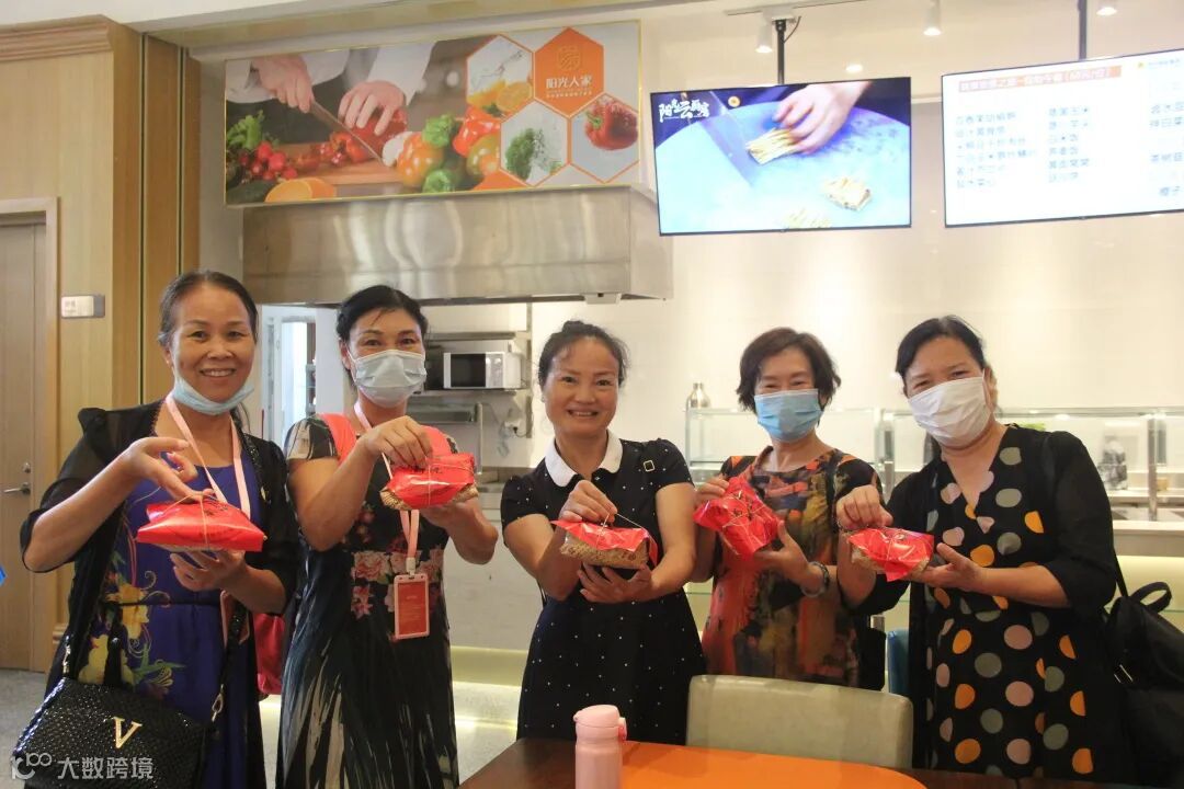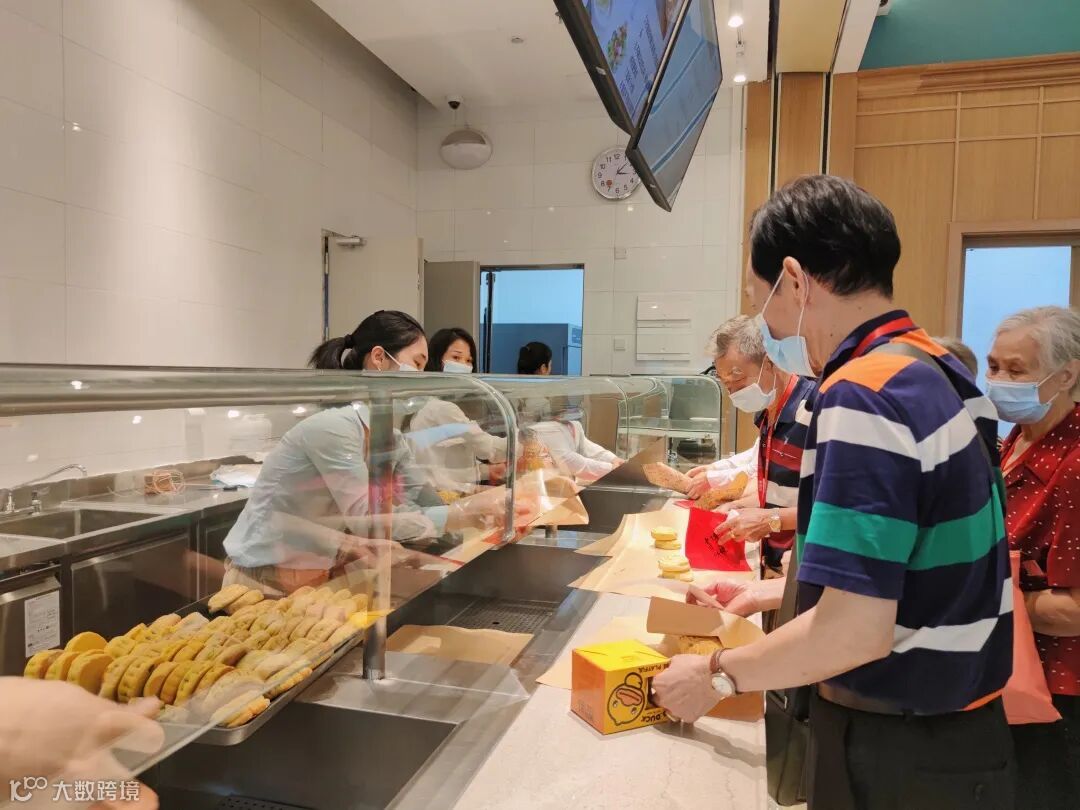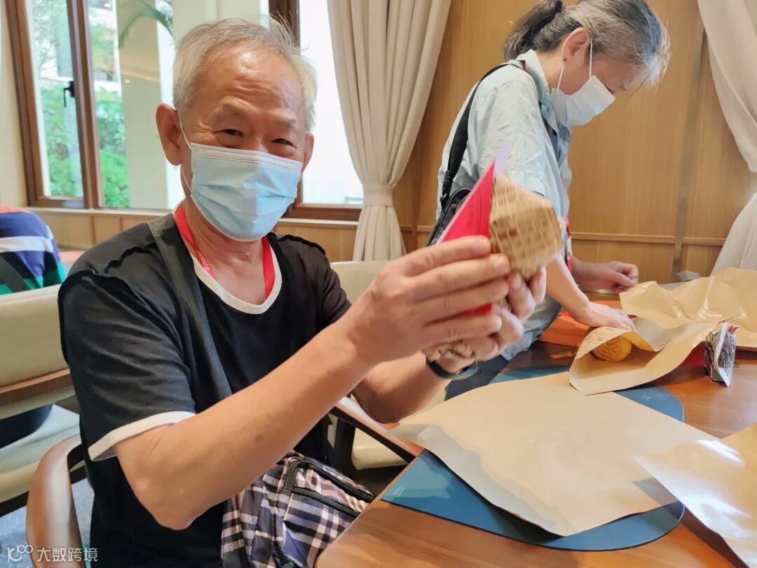 在餐厅里,阳光爸妈们亲自动手包起了月饼,社区餐饮部为阳光爸妈们准备了面皮、月饼馅、和“家”字模具,并由专业的面点师现场教学。