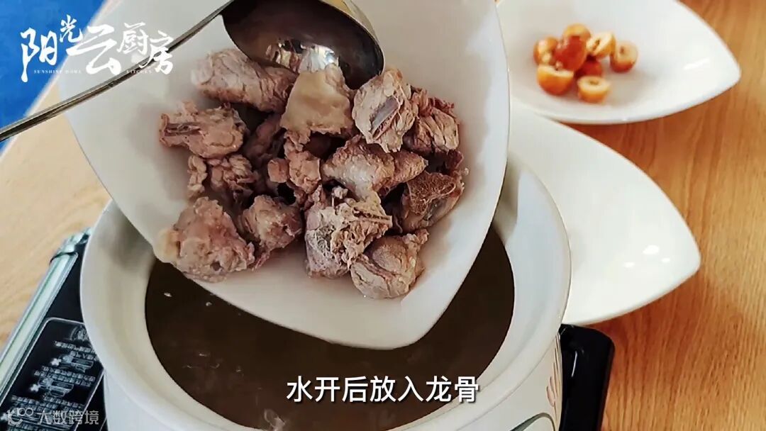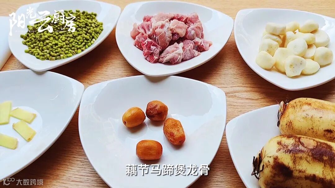 把绿豆、马蹄、莲藕、蜜枣、姜片依次放入锅中