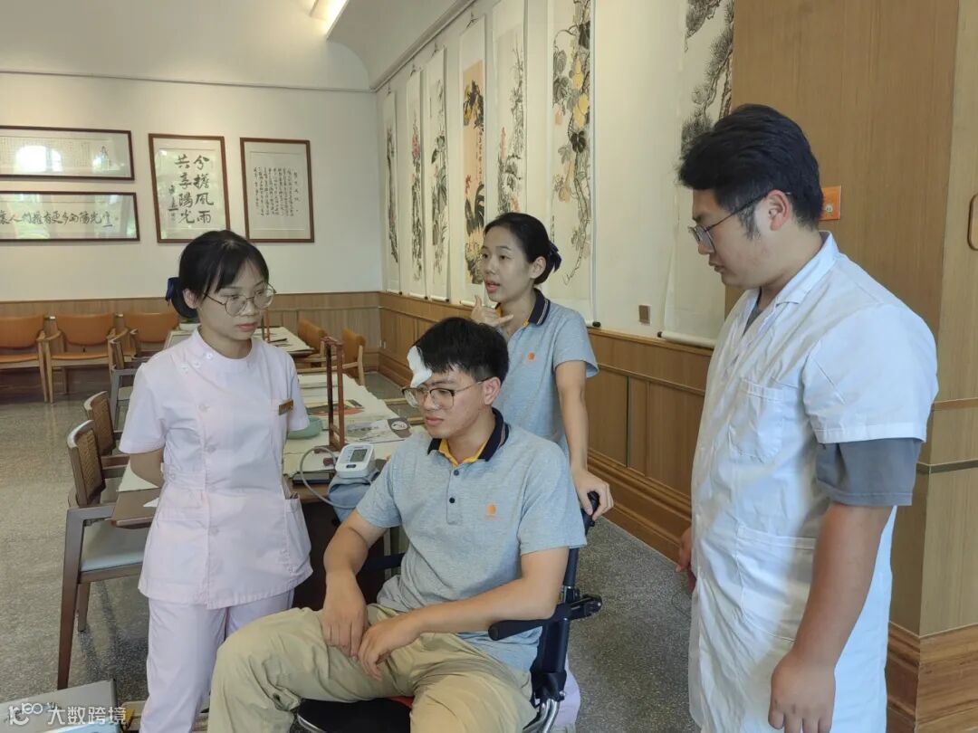 医⽣联系家属:“李叔家属您好,我是阳光人家的医⽣,刚才李叔在参加活动时突然想起身跳舞,⾃⼰在轮椅上站起来时脚步不稳不⼩⼼摔倒了,额头上蹭破⽪流了点⾎。