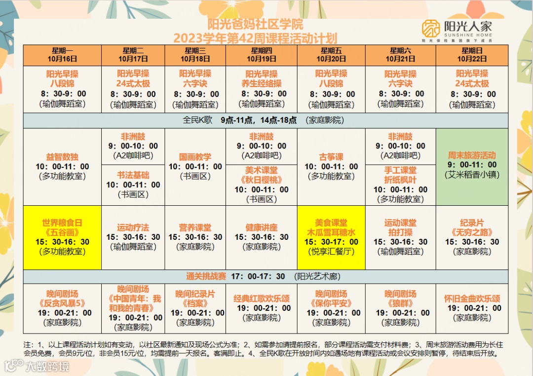 本周一是世界粮食日,更有各式养生操、各类兴趣小组、外出周边游玩等丰富多彩的课程文娱活动等您来体验!