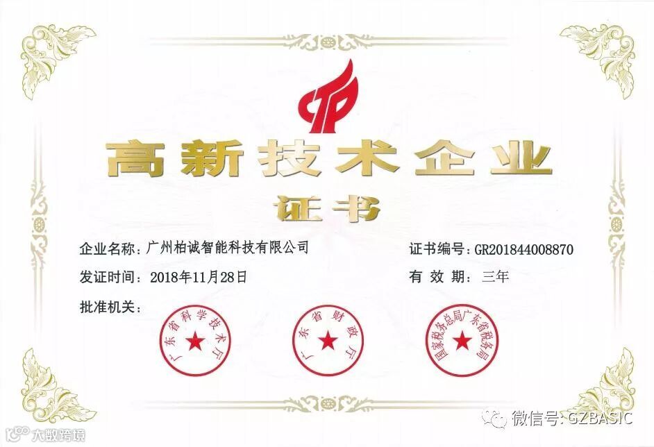 日前,柏诚继2001年以来,再次荣获由广东省科学技术厅、广东省财政厅、国家税务总局广东省税务局颁发的“高新技术企业”证书,证书编号为GR201844008870。