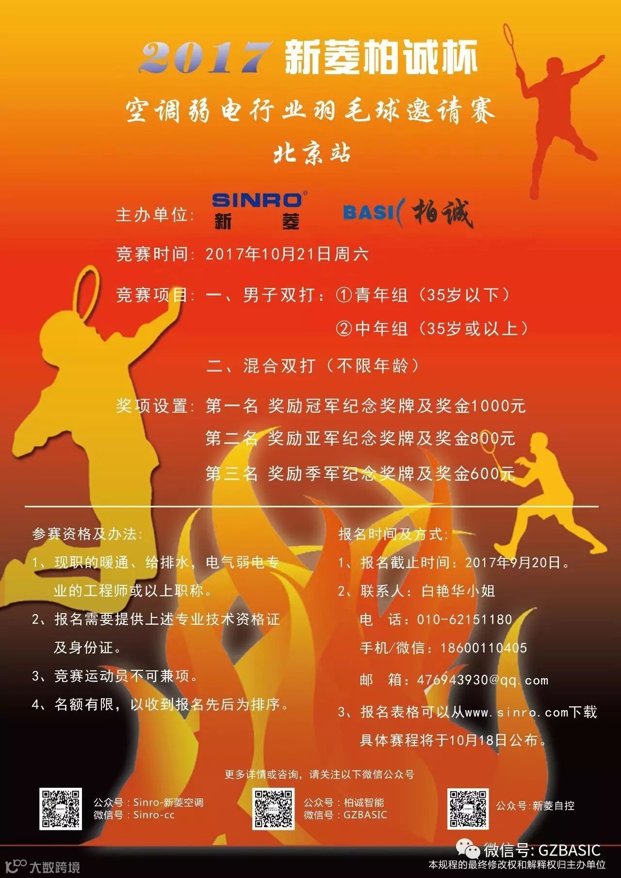 由新菱集团和广州柏诚智能科技有限公司联合主办的“2017新菱柏诚杯”空调弱电行业羽毛球邀请赛(北京站)现在开始接受报名了!我们诚邀业内羽毛球爱好者踊跃参加,精英荟萃,各展风采!