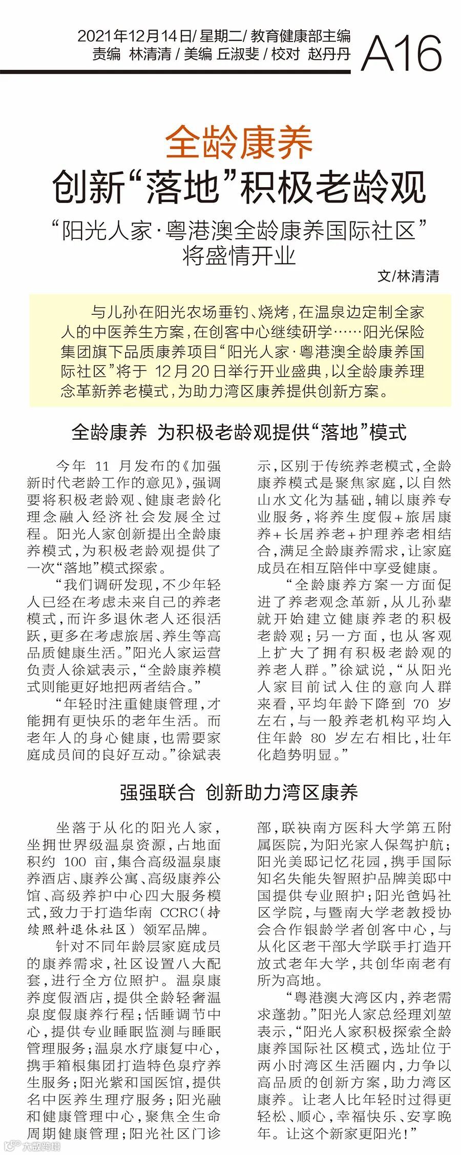 与儿孙在阳光农场垂钓、烧烤,在温泉边定制全家人的中医养生方案,在创客中心继续研学……阳光保险集团旗下品质康养项目“阳光人家·粤港澳全龄康养国际社区”将于 12月20日举行开业盛典,以全龄康养理念革新养老模式,为助力湾区康养提供创新方案。