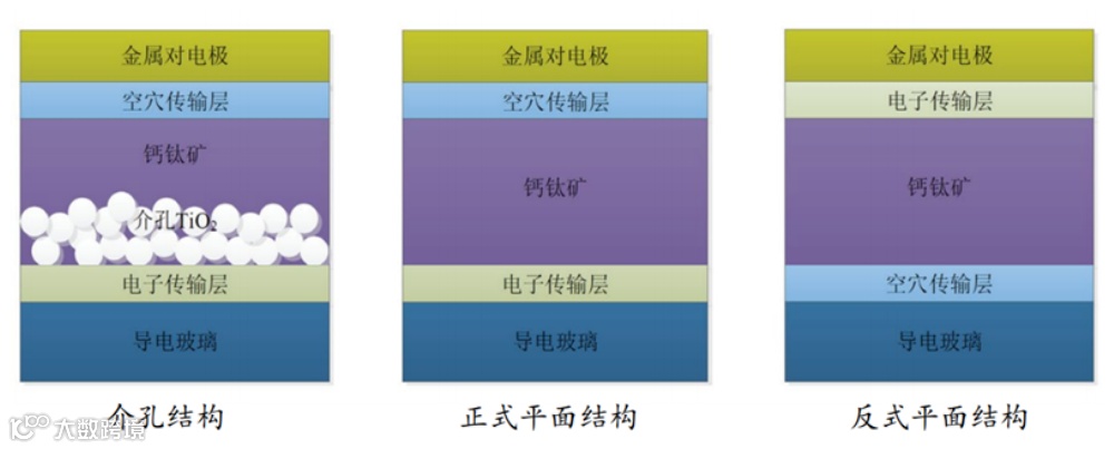 单结电池结构主要分为介孔结构和平面结构,平面结构又被分为正式结构(n-i-p)和反式结构(p-i-n)。根据有无介孔骨架电子传输层,区分介孔结构和平面结构;根据透明导电电极上先为电子传输层,还是先为空穴传输层,区分正式结构和反式结构。