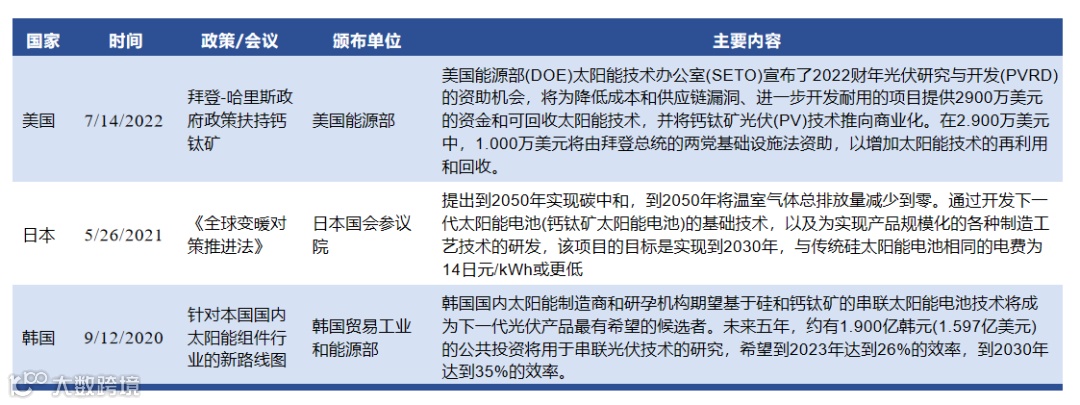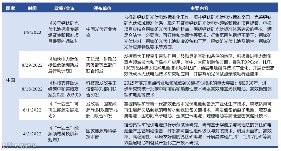 过去十年钙钛矿光伏在学术界的重大突破推动钙钛矿产业化进程。由于钙钛矿光伏与以晶硅光伏为主导的现有光伏产业链具有较大差异,钙钛矿光伏的崛起势必将重塑整个产业链。目前不仅产业端在积极推动钙钛矿商业化,政策端也不断刺激钙钛矿产业化。