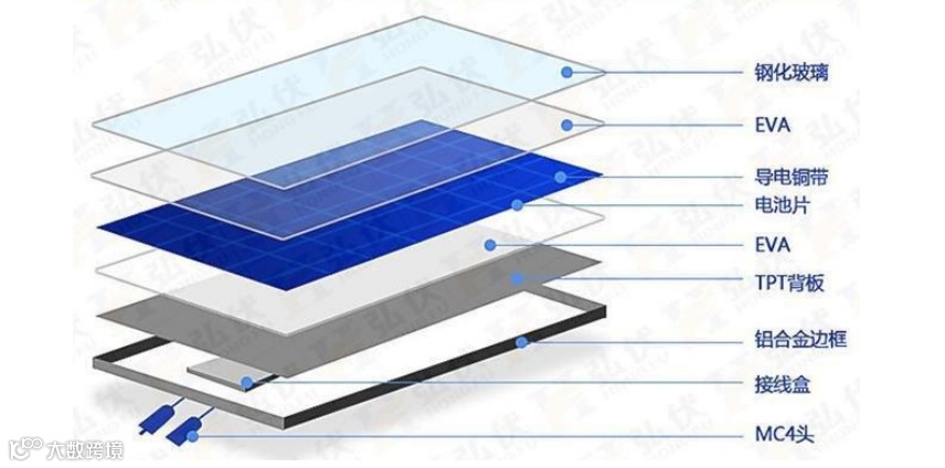 相比于结构简单的钙钛矿电池来说,单晶硅电池结构相对复杂,主要有钢化玻璃、EVA、电池片、TPT背板、铝合金边框、接线盒、MC4头组成。其中,电池片主要由晶硅构成。