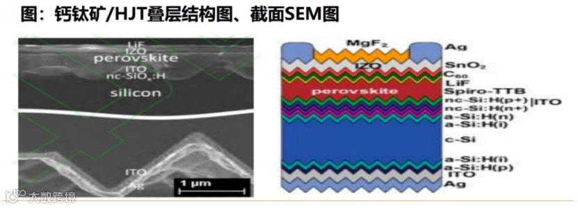 钙钛矿可以与HJT、TOPCon等晶硅电池组成叠层电池,其中HJT与钙钛矿叠层最为适配。晶硅电池工艺成熟,作为底电池较为稳定,相比其他类型叠层具备潜在的低制造成本;HJT由于具备良好的非晶硅钝化层、对称结构以及透明导电氧化物(TCO),与钙钛矿层最为适配。