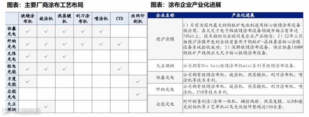 涂布设备主要用于制作钙钛矿吸光层。目前国内钙钛矿层制备工艺主要采用狭缝涂布机进行制备,有协鑫光电、纤纳光电、无限光电、极电光能、万度光能几家企业布局;协鑫光电、纤纳光电、无限光电、极电光能等厂商同时进行旋涂机、蒸镀PVD工艺布局;刮刀涂布、喷涂、CVD、丝网印刷机属于少数技术选择方向。