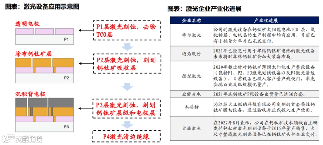激光企业产业化进程较快。帝尔激光的激光设备在钙钛矿太阳能电池TCO层、氧化物层、电极层的生产制程中均有应用,目前已有小批量订单并已完成交付。迈为股份2021年已经交付用于单结钙钛矿电池的激光设备,未来将对单结钙钛矿会加大装备布局。德龙激光2020年推出针对钙钛矿薄膜太阳能生产整段设备(包括P1、P2、P3激光划线设备以及P4激光清边设备),目前设备已投入客户量产线使用,率先实现百兆瓦级规模化量产。