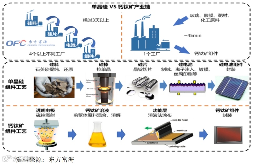 工艺简单,产业链缩短。对于晶硅来说,硅料、硅片、电池、组件需要4个以上不同工厂生产加工,一片组件的制造时间需要3天左右;而对于钙钛矿只需要1个工厂,从玻璃、胶膜、靶材、化工原料进入,到组件成型,总共只需45分钟。