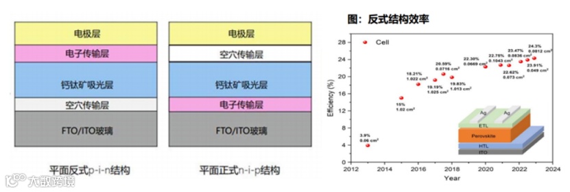 正式结构和反式结构主要区别是,光先透过电子传输层还是空穴传输层。对正式结构而言,透明电极上为电子传输层,太阳光穿过透明电极后,透过电子传输层再到吸光层;对反式结构而言,透明电极上为空穴传输层,太阳光穿过透明电极后,透过空穴传输层再到吸光层。