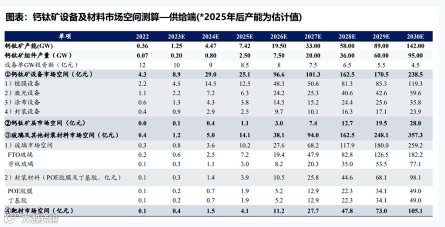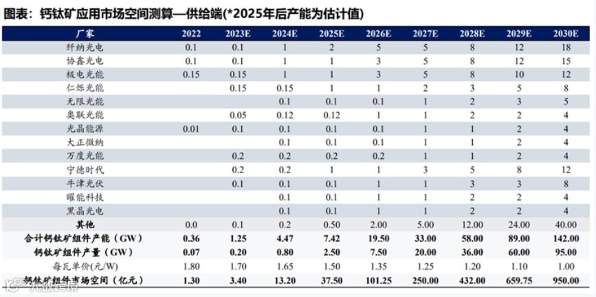 目前钙钛矿还未大量生产,部分厂家已经进入中试阶段。从供给端来看,预计2025年钙钛矿组件市场空间达37.5亿元,2030年达950亿元。按照各家厂商发布的量产规划,2023年合计钙钛矿组件产能1.25GW,2025年7.4GW,预计组件市场空间约37.5亿元,2030年钙钛矿组件产能预计142GW,对应市场空间约950亿元,2022-2030CAGR达128%。