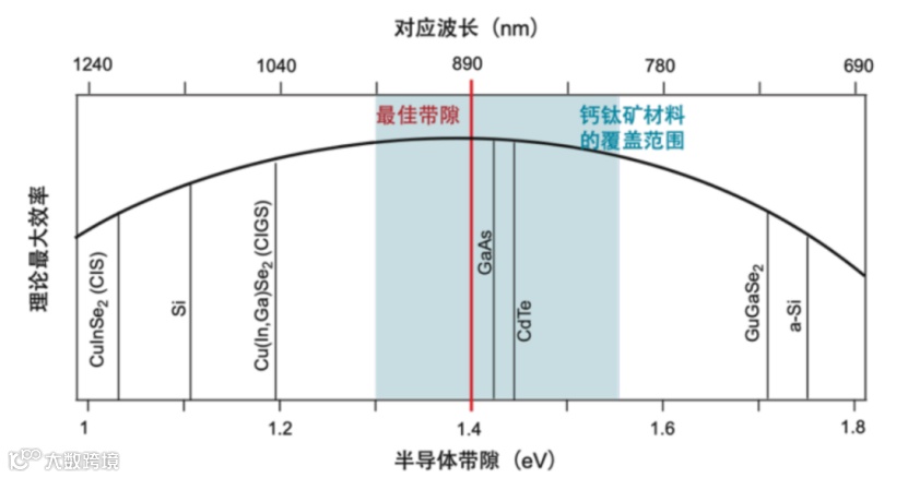 光伏特性可调。钙钛矿材料可以通过调节组分,使其能带间隙在1.4~2.3eV之间连续可调,因此可以衍生出区别于硅基光伏的应用,如(1)调整带隙至2eV左右,使其适用于弱光下高效发电;(2)用于建筑玻璃上,将钙钛矿薄膜做成不同颜色或者半透明的状态,做在质轻的柔性基底上实现建筑光伏一体化,即BIPV或者BAPV;(3)制成叠层电池,设计不同带隙的钙钛矿层,并彼此或是与其他光伏材料叠加,从而使不同波长的光能转化成电能,这也是有望推动钙钛矿电池突破肖克利-奎瑟极限的主要方式之一。而相比较之下,晶硅光伏电池只有单一的带隙,性能的优化空间与应用场景均十分有限。