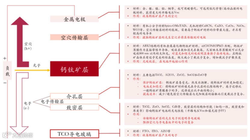 介孔结构类似三明治层状结构,结构简单,主要分为透明导电电极、介孔电子传输层、钙钛矿吸收层、空穴传输层、金属电极五层。其中介孔电子传输层是将钙钛矿受光子激发后的电子提取出来,同时阻挡空穴向阴极方向迁徙;其具备较高的光透过率,便于更多光子照在钙钛矿吸收层上;介孔为钙钛矿吸收层提供骨架支撑的作用;主要材料是TiO2。