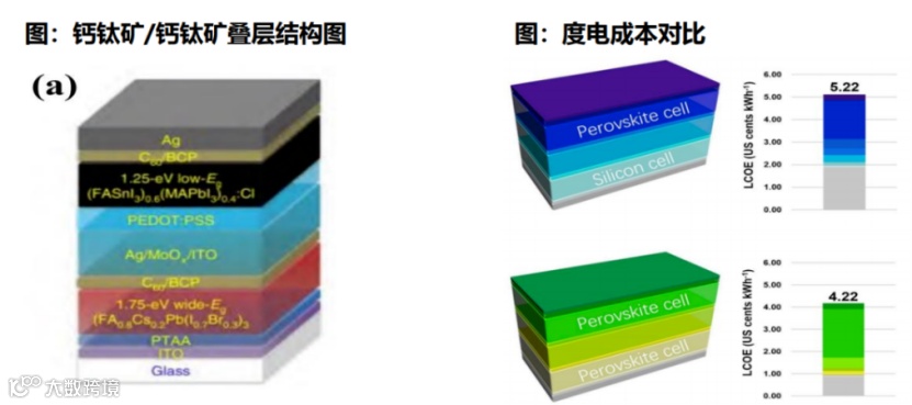 钙钛矿/钙钛矿叠层,是通过人工分别合成宽带隙和窄带隙钙钛矿。由于钙钛矿带隙可调节,将窄带隙(1.25eV左右)钙钛矿作为底电池,宽带隙(1.75eV左右)钙钛矿作为顶电池。
