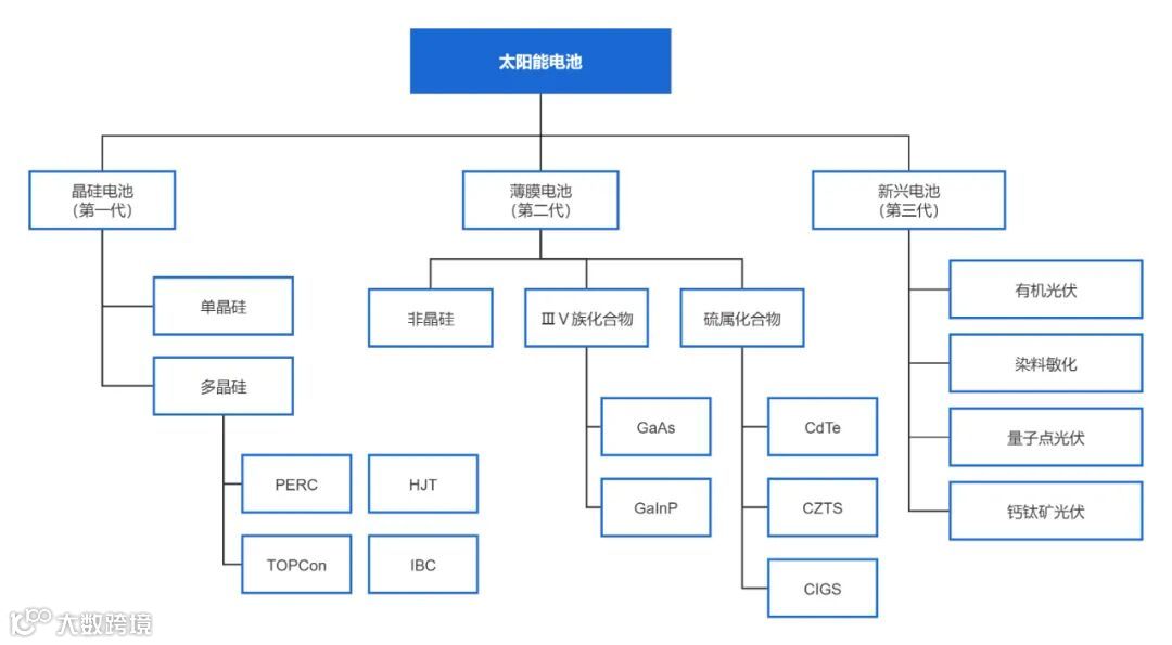 过去在60多年的时间里,已经有三代太阳能电池发展出来。第一代是以硅材料为基本材料的太阳能电池,是目前最成熟的主流商业电池;第二代是薄膜太阳能电池,以铜铟镓硒(CIGS)、碲化镉(CdTe)电池为代表,相比第一代具有厚度薄、光电转化效率高等的优势,但部分因素也限制了这类电池的发展,如部分材料储量稀少或有毒性,制备过程复杂等;第三代为新型太阳能电池,主要包括钙钛矿太阳能电池、染料敏化太阳能电池、有机太阳能电池和量子点太阳能电池。
