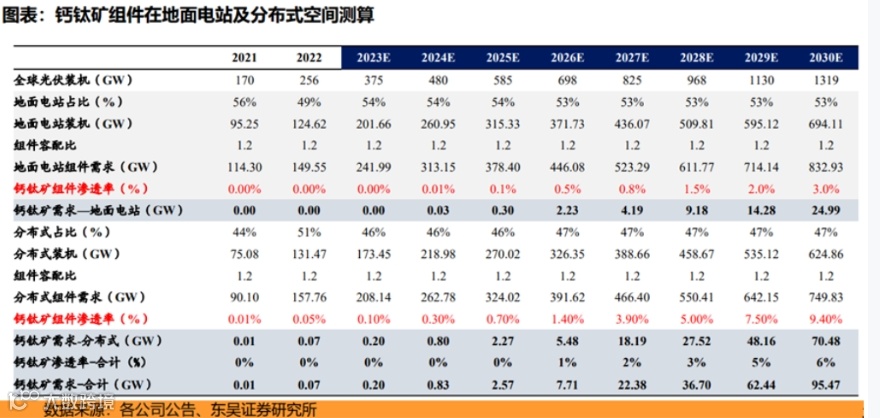 在需求端,光伏装机需求向好叠加渗透率高增,钙钛矿组件市场空间广阔。假设2023/2025/2030年全球光伏装机分别为375/585/1319GW,组件在地面电站渗透率由2023年的0%逐步提升至2030年的3.0%,2025/2030年全球地面电站钙钛矿需求分别为2.3/25.0GW;在分布式中的渗透率由2023年的0.2%提升至2030年的9.4%,2025/2030全球分布式钙钛矿需求分别2.3/70.5GW,2025/2030整体市场空间为2.6/95.5GW,2022-2030CAGR达146%,市场空间广阔。