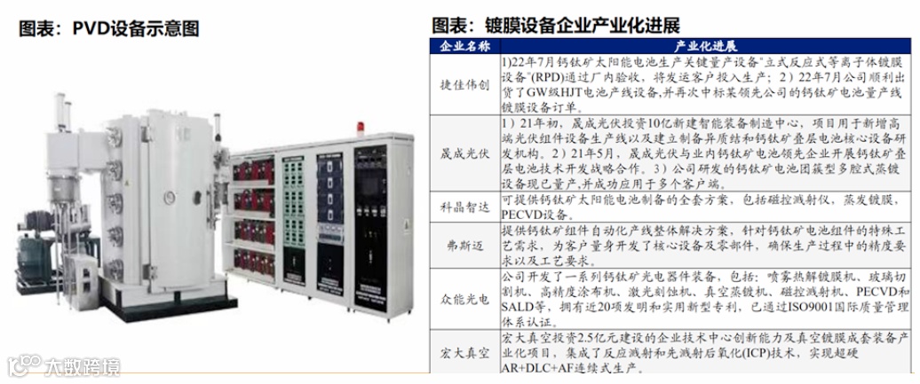 镀膜设备主要涉及PVD、PRD、ALD三种,PVD技术又分为真空蒸镀法、溅射法和离子镀法。背电极主要使用蒸镀PVD,目前已经比较成熟,还可使用PRD等离子反应设备制作。电子传输层主流使用RPD设备,或先用RPD或ALD设备制作阻隔层,再用溅射PVD做传输层。空穴传输层主流使用溅射PVD,也可使用蒸镀PVD;玻璃基板衬底:使用溅射PVD形成导电层,技术较为成熟。生产百MW级钙钛矿需要镀膜设备3台,其中包括2台PVD,单价1000万/台;1台PRD,单价2000万/台。