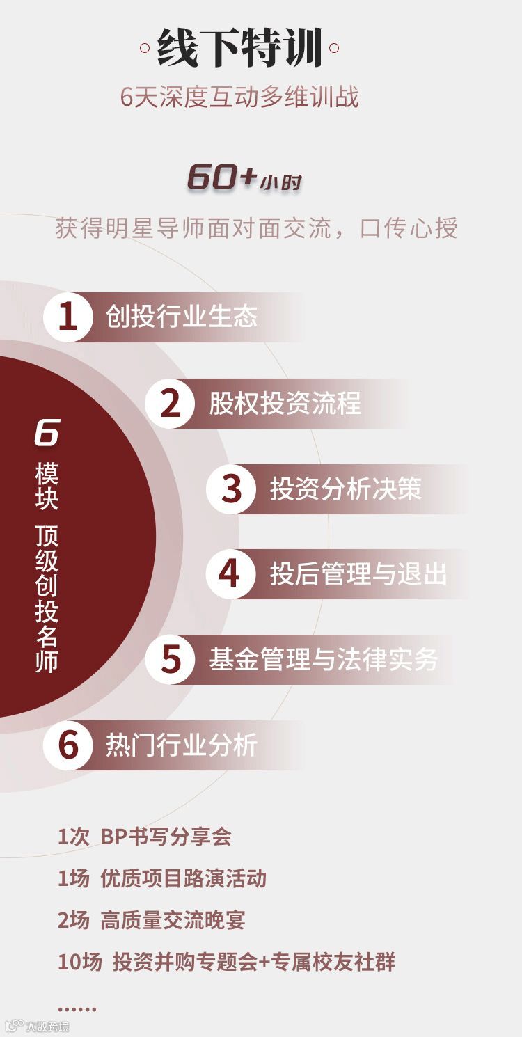 VCA培训班内容涵盖了从股权投资入门基础与趋势、“募投管退”各阶段运作全流程、投前分析、投资决策、投后管理与退出、从业者职业发展和各行业投资逻辑解析等超一流的方法论和最一线实战案例内容
